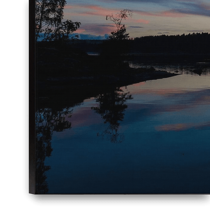 Sunset over a calm lake in Sweden during a summer evening. The clouds and silhouettes of the trees are reflected in the lake.