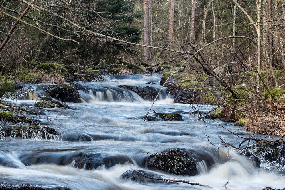 Running water from a stream in the Swedish landscape in the province of Småland, Kalmar län they are the first days of winter.