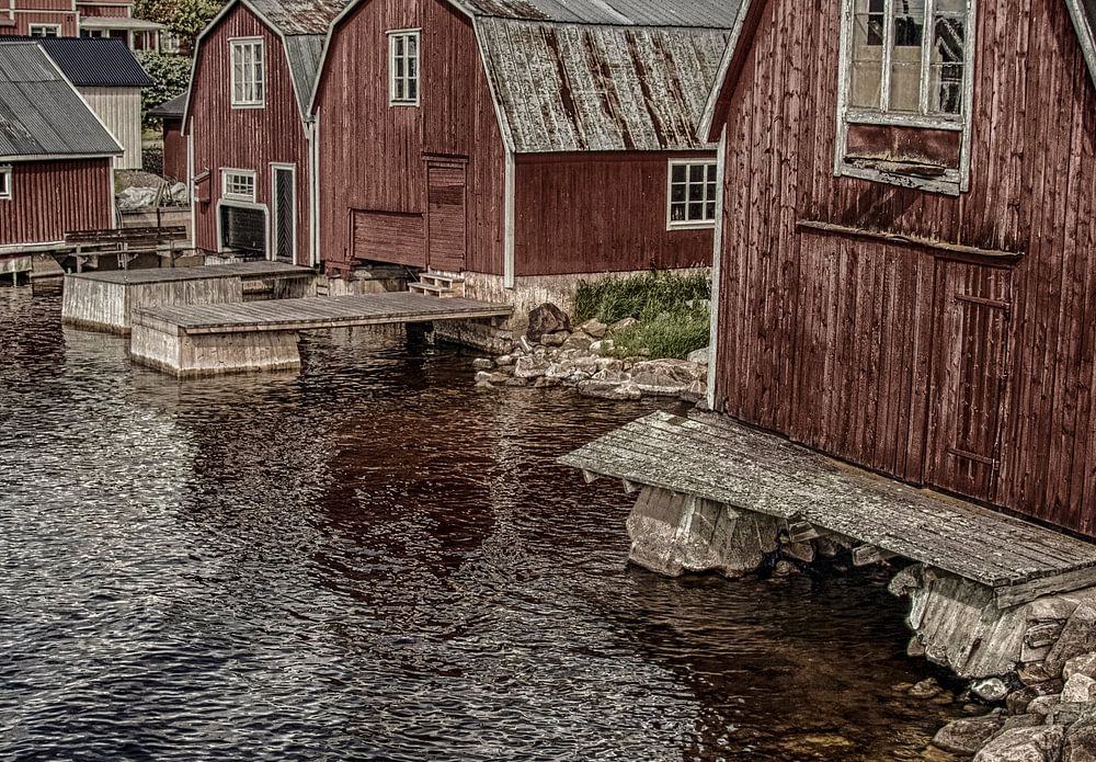 Landscape photo with houses in Stocka Sweden in a fjord a fishing village