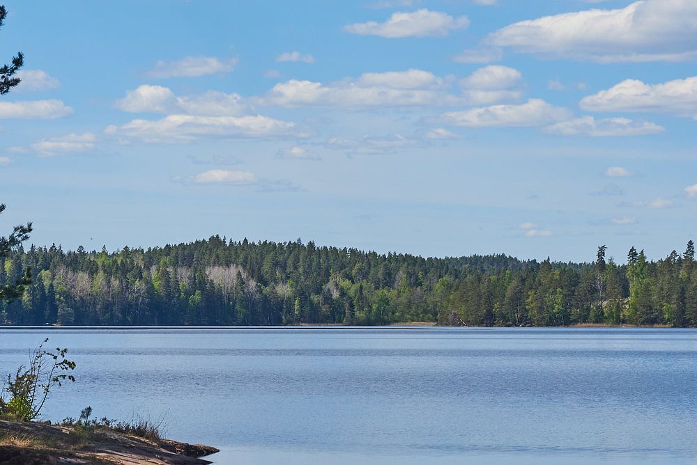 Swedish landscape with a lake and some stones and trees in the foreground and a blue sky of clouds.