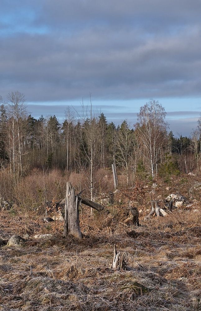 A typical Småland forest landscape with a threatening sky and in the foreground forestry the composition of the soil is typical of this environment
