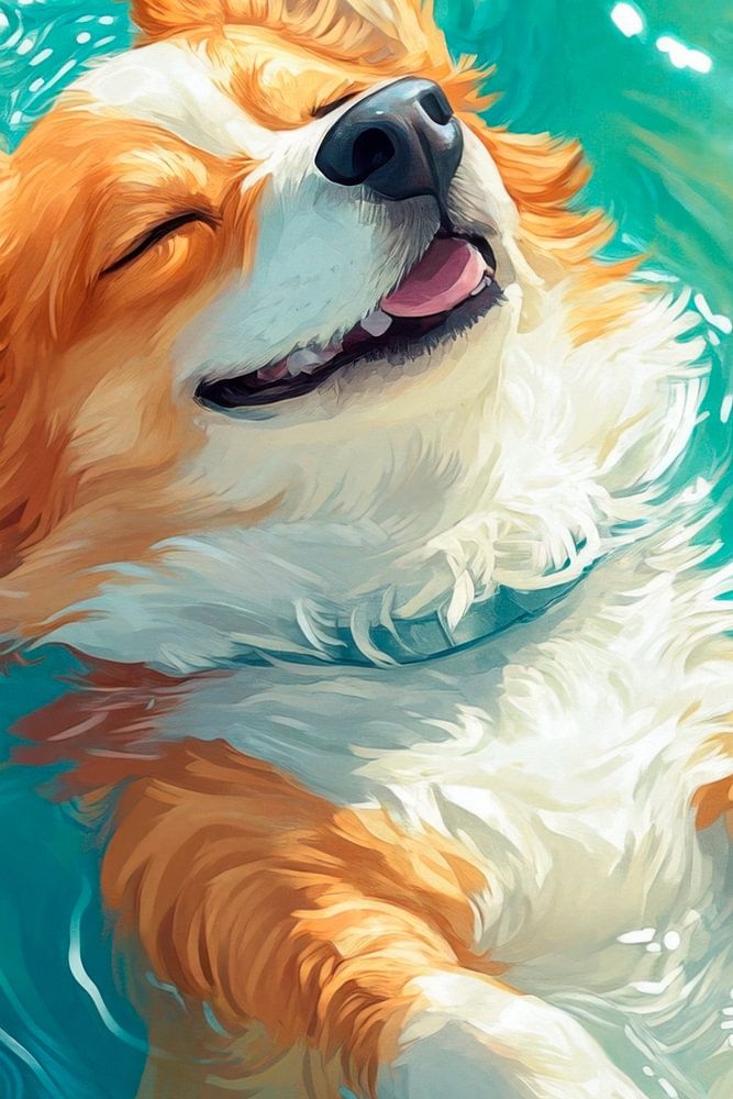 Pure relaxation unfolds amidst glistening water surfaces: a cheerful little corgi floats carefree in the clear water, eyes closed and grinning broadly. The gentle waves around him reflect the sun's rays and create an atmosphere of carefree happiness, while his soft, orange-coloured fur shimmers vividly.