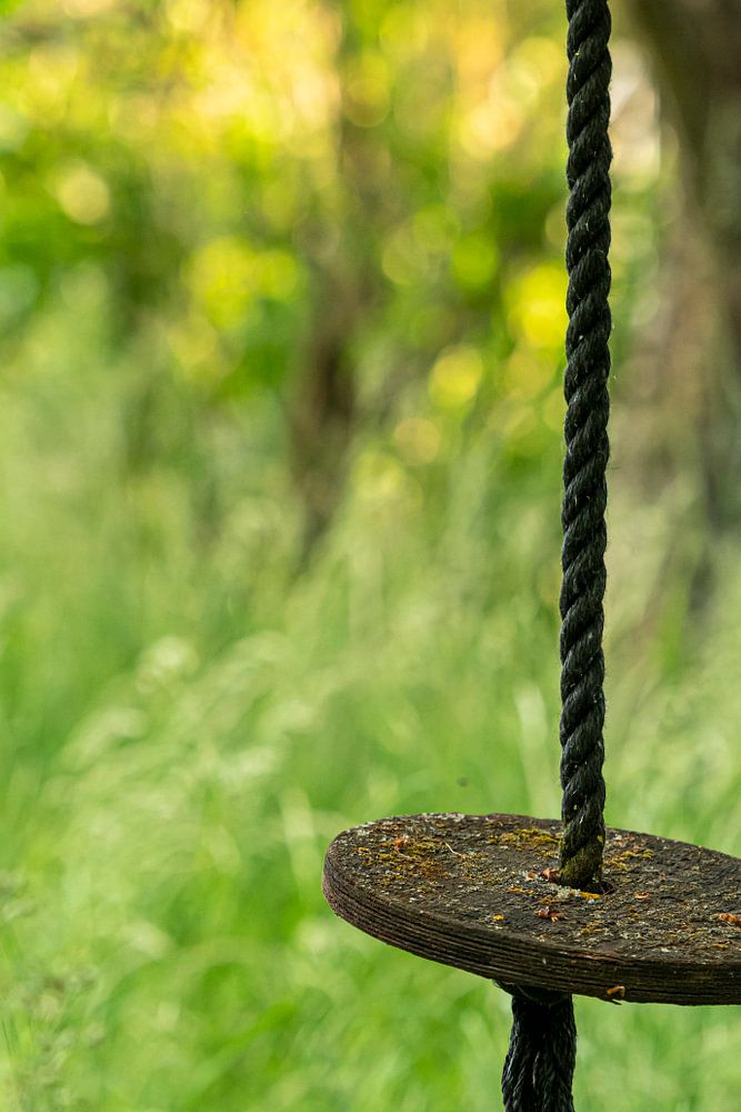 Swing from a wooden disc hangs from a thick rope in a wild garden by Hans-Jürgen Janda