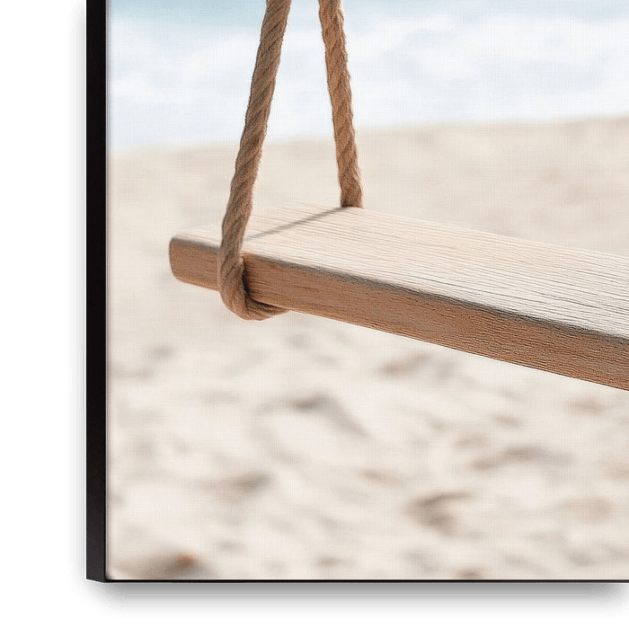 A gentle wooden swing swinging over fine sand magically attracts the eye and lends any room a calm, relaxed atmosphere. The glittering water in the background creates a feeling of freedom and light-heartedness. Ideal for the living room to evoke memories of sunny days at the beach and create an inviting atmosphere.