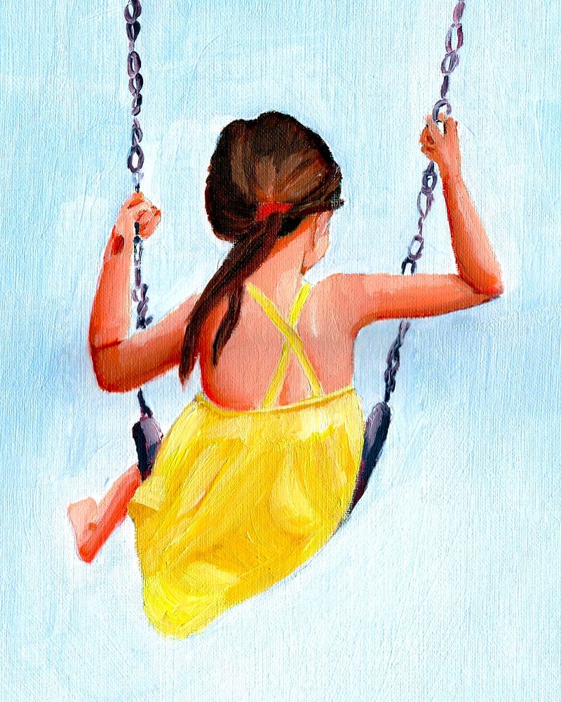 Inspired in my own kids, this painting captures the fleeting, weightless magic of childhood. I wanted to freeze a moment of pure joy — the kind that happens when you’re flying forward on a swing, hair brushing your back, dress lifted by the wind, with nothing but sky ahead.