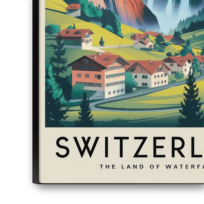 With gentle hills and majestic waterfalls, this art scene draws the viewer into an idyllic Alpine landscape. The vibrant colours and harmonious interplay of nature and architecture add a touch of freshness to any room. Ideal for the living room to create a relaxing, inviting atmosphere.