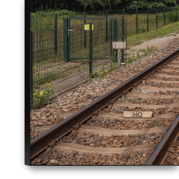 Buy the photo Symmetrical railway track with unique monumental overhead wires in arch form by Robin Jongerden on canvas, ArtFrame, poster and wallpaper, printed on demand in high quality.