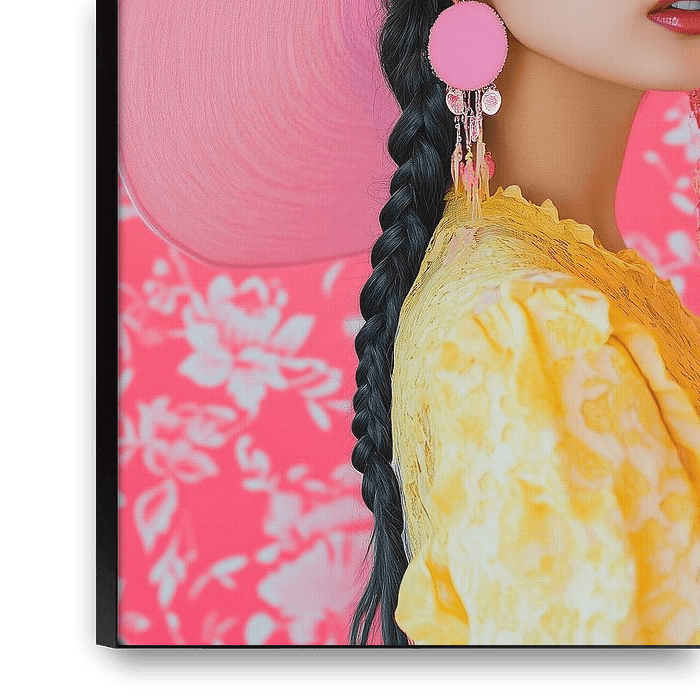 "Symphony of Yellow and Pink" shows an Asian woman embodying a harmonious balance of colours and elegance. She wears a striking yellow dress reminiscent of the warmth and vibrancy of the sun. Her outfit is accentuated by a large, pale pink hat, which falls gracefully over her head and adds a touch of delicate femininity. Her pink…