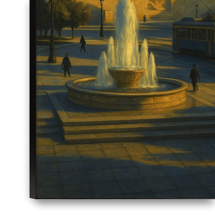 Syntagma Square Serenity transforms one of Athens’ most symbolic places into a masterpiece of light and reflection. The grand façade of the Hellenic Parliament glows under the descending sun, while the fountain sparkles with movement and soft radiance. A tram passes slowly by, and figures cross the square, their elongated shadows…