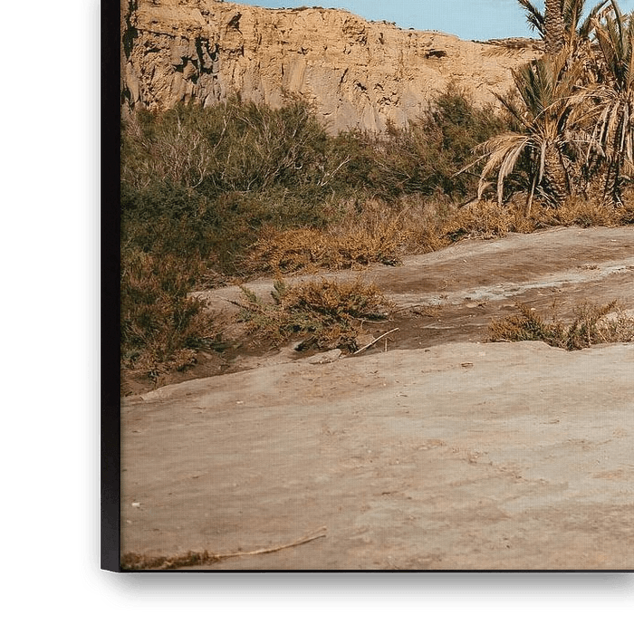 Horizontal photo print of the Tabernas desert in Spain. A very beautiful and rough area which is called the Grand Canyon of Europe. Many Holywood movies have been recorded here. The palm trees are planted here for movies, some are still standing. Travel photography print.