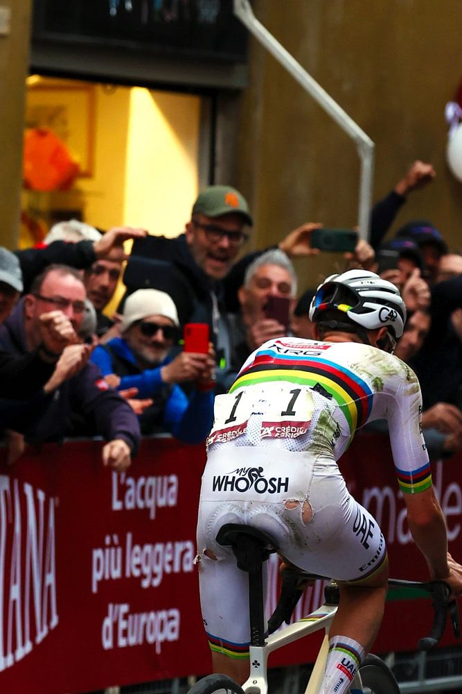 In the world champion jersey and with the strat number 1, Tadej Pogacar storms up the final climb of the Strade Bianche in Siena, the "Via Santa Caterina". Once at the top, all that remains is to receive the applause and enjoy the last 500 metres to the finish. Get this unique photo now. You can clearly see the marks of his fall earlier in the race.