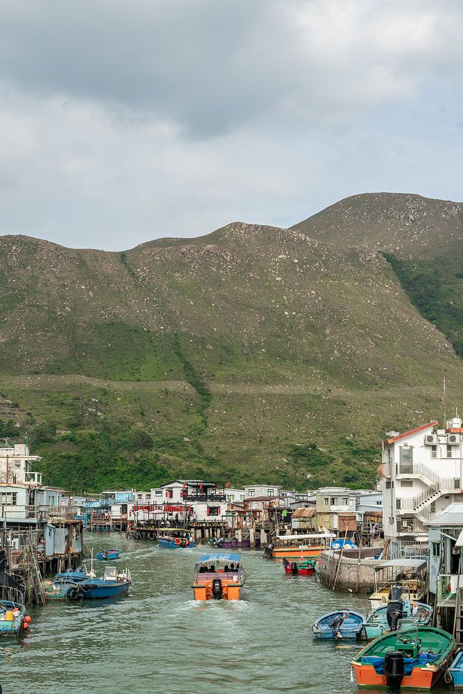 The center of Tai O fishing village in Hong Kong with in the middle a river with boats and along the sides houses, shops and bars.