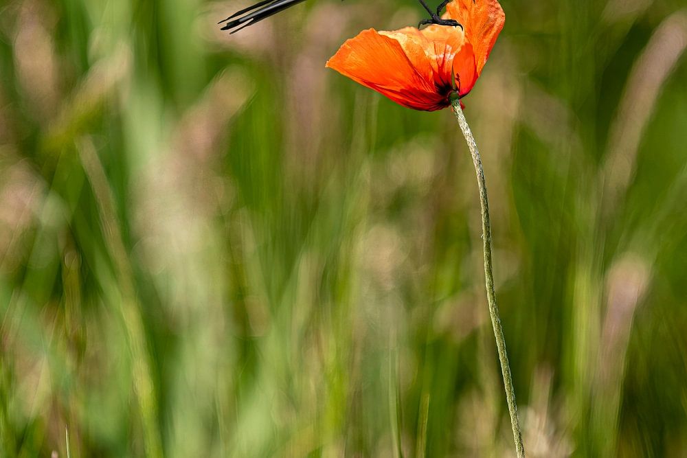 Apparently it is quite a lightweight bird as the poppy does not sag under its weight this shot is an edit but no less real for that.