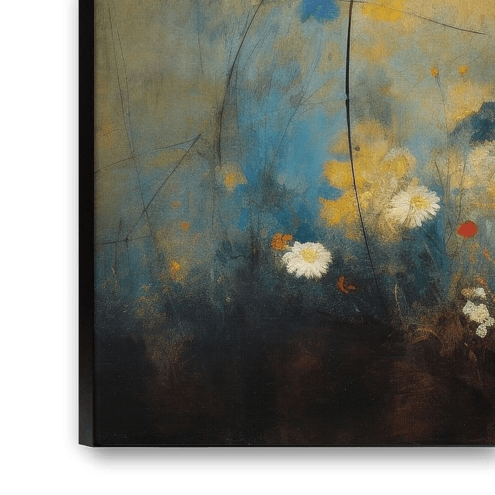 Picturesque portrait of a young woman wandering in a colourful landscape. Red, blue, yellow and orange complement each other in this work. Exclusive to Werk aan de muur.