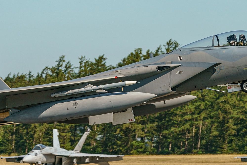 A McDonnell Douglas F-15C Eagle of the Louisiana Air National Guard takes off from Fliegerhorst Hohn during exercise Air Defender 2023.
