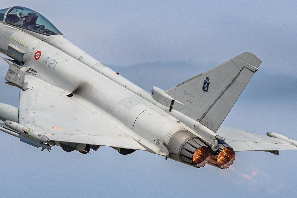 Take-off Italian Eurofighter Typhoon with afterburner.