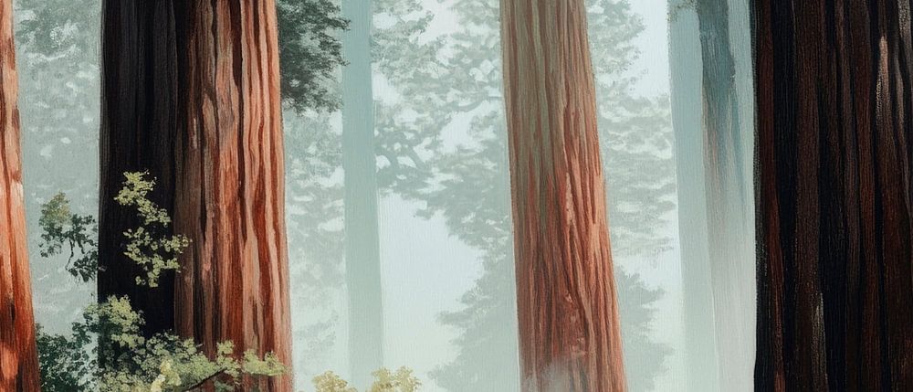 A harmonious forest landscape unfolds in the midst of majestic, reddish-brown giant trees, interspersed with gentle wafts of mist. The play of light between the branches creates an almost magical atmosphere. This picture brings peace and closeness to nature into the living room - a perfect retreat that invites you to dream and linger.