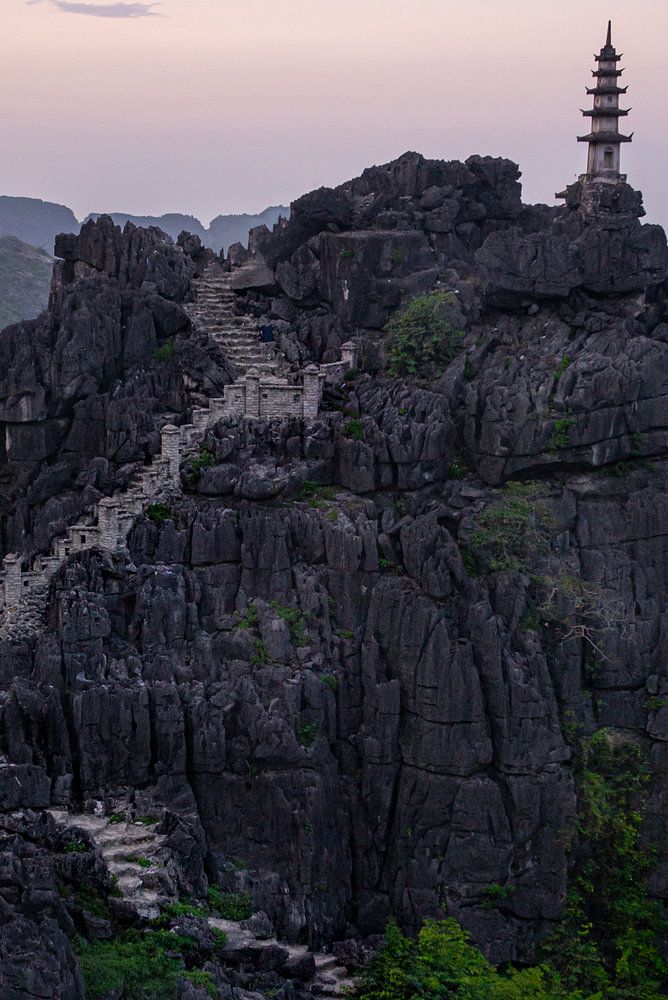 The popular view of Ninh Binh, the peaks of Tam Coc, Vietnam. Travel Photography. Beautiful oriental wall decoration with a pastel colored sunset.