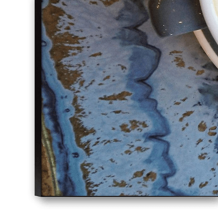 Top view of a bowl of coffee, stood on an old-fashioned coffee table, made of natural stone. Beautiful blue color. Close-up, indoor, hot drink, mosquito, coffee, table, no people