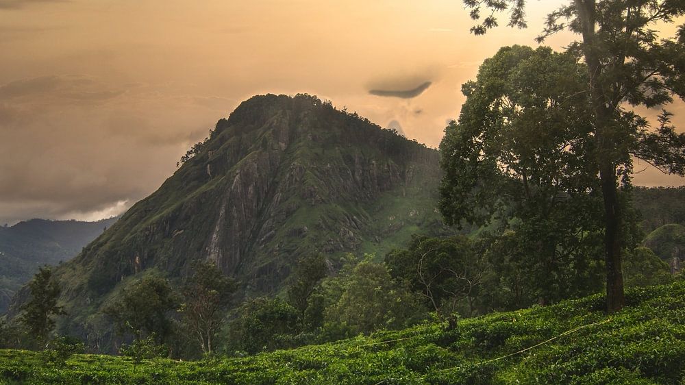 The sun breaks through the clouds in the mountains of Sri Lanka and bathes the bushes of the tea plantation in warm light.
