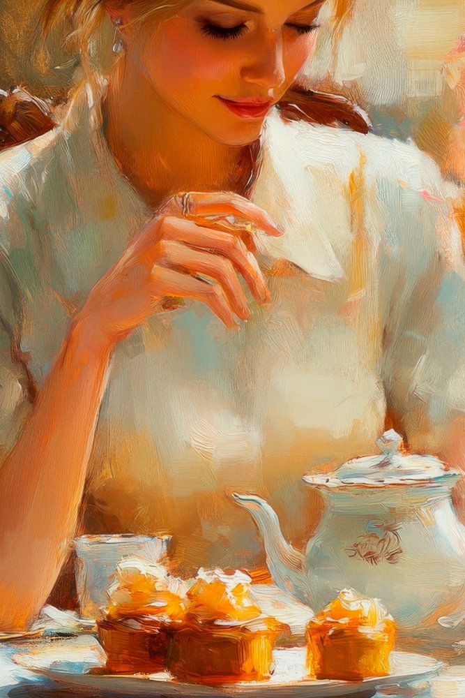In a warm glow of light, surrounded by delicate flowers, sits a young woman in elegant clothes, deep in thought. A table full of delicious treats and a stylish teapot unfold before her, while the gentle scent of tea fills the air. Her thoughtful expression radiates a calm elegance.