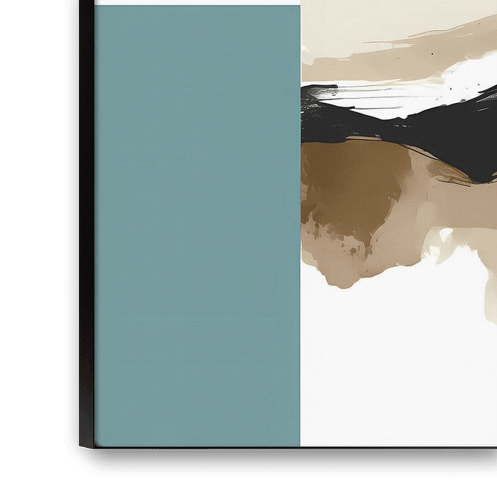 This creation consists of two rectangular panels, one filled with a deep teal colour and the other with earth brown. The rest of the artwork contains abstract colour elements. It creates a visual contrast between the clean shapes and the freer abstract colours, creating a captivating whole. It is a work of art that plays with the balance between structure and abstraction, inviting the viewer to discover the nuances and emotions behind the different colours. This stunning creation has been digitally edited using artificial intelligence, resulting in the highest possible image quality. Even up close, the lines and figures remain razor-sharp and detailed, making the artwork a stunning visual experience.