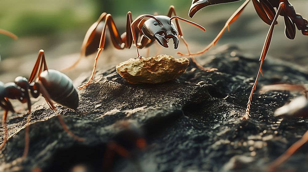 Capture the awe-inspiring coordination and teamwork of ants as they gather food. This stunning macro photograph showcases the intricate details and harmonious collaboration in nature, perfect for anyone interested in entomology or wildlife photography.