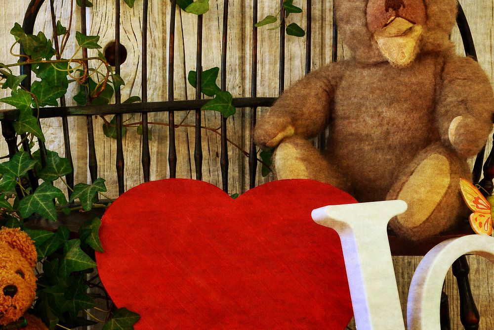 Two teddy bears with heart and love word, with bench, ivy and texture in front of wooden wall