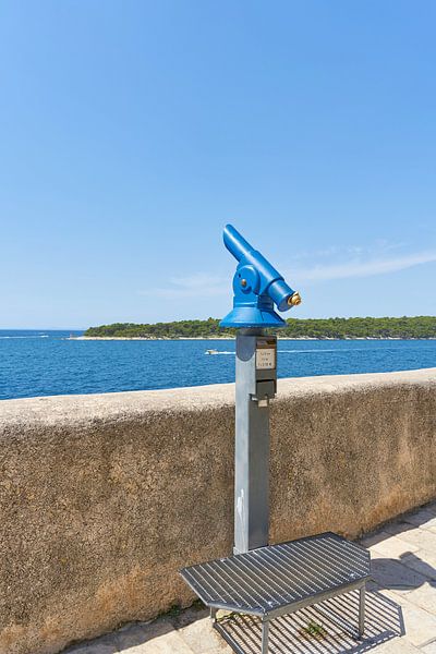 Telescope at a viewpoint at the Katedrala Uznesenja B.D.Marije in the old town of Rab on the Adriatic Sea in Croatia on a hot summer day. From here you have a very good view of the offshore islands.