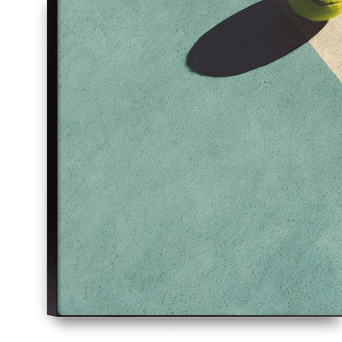 A single tennis ball lies exactly on the intersection of colour areas. The harsh sunlight and long shadows enhance the graphic character. A minimalist image about focus, stillness and the moment before movement.