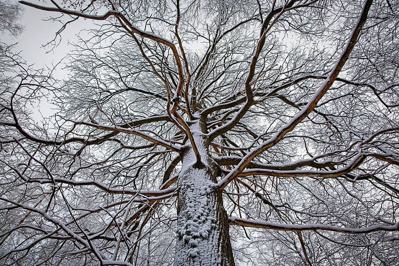 A tree in South Limburg's Eyserbos spreads its tasks in all directions with the thin layer of snow enhancing the contrast.