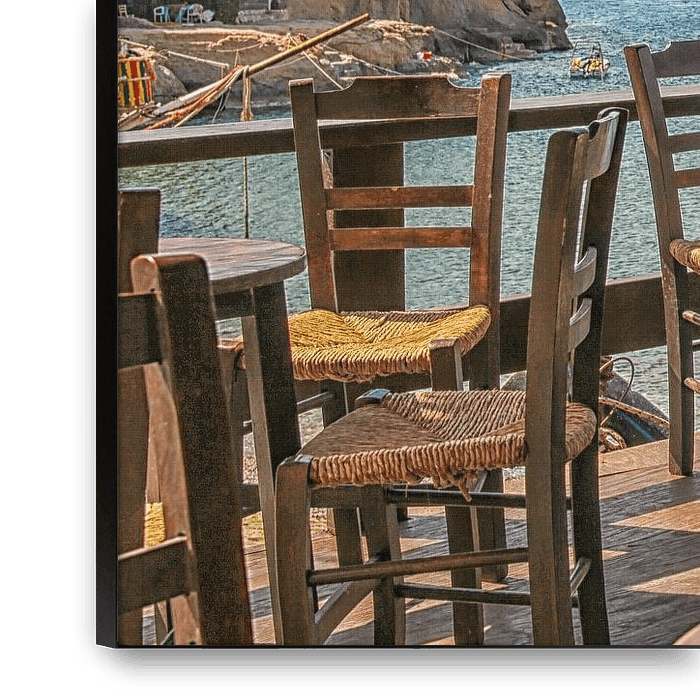 Terrace of restaurant on Matala beach with sea view, Crete, Greece