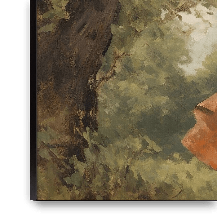 Terracotta Dance | Impressionist Dance - We see a woman in a rural setting, dressed in a white blouse and a swirling terracotta skirt. The brushwork and choice of colours suggest an impressionist style, focusing on the play of light and shadow through the leaves, with a sense of movement and zest for life splashing from the…