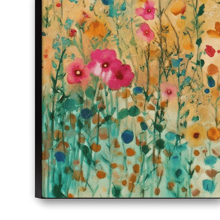 A gentle whisper of rust-brown dots in a sea of calm. On the canvas, a carpet of delicate petals unfolds in warm terracotta and subtle mint-green flecks, as if nature is painting its own palette at dusk. Between the slender stems, tiny peach-coloured buds glisten with an almost silvery glow, a surprising detail that is only noticeable on closer inspection.