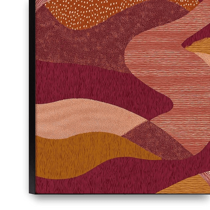 A mesmerizing abstract artwork inspired by natural landscapes, where flowing organic forms in warm terracotta, ochre, and burgundy hues embrace each other in a hypnotic rhythm. With a captivating blend of textures—from delicate dots to elegant line patterns—this work creates a profound visual dance between earthy forces and serene…