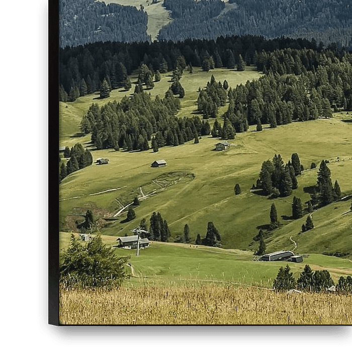 Buy this landscape artwork The Alpe di Siusi with Sassolungo, Sassopiatto and Sella by Martina Weidner on canvas, ArtFrame, poster and wallpaper, printed on demand in high quality.
