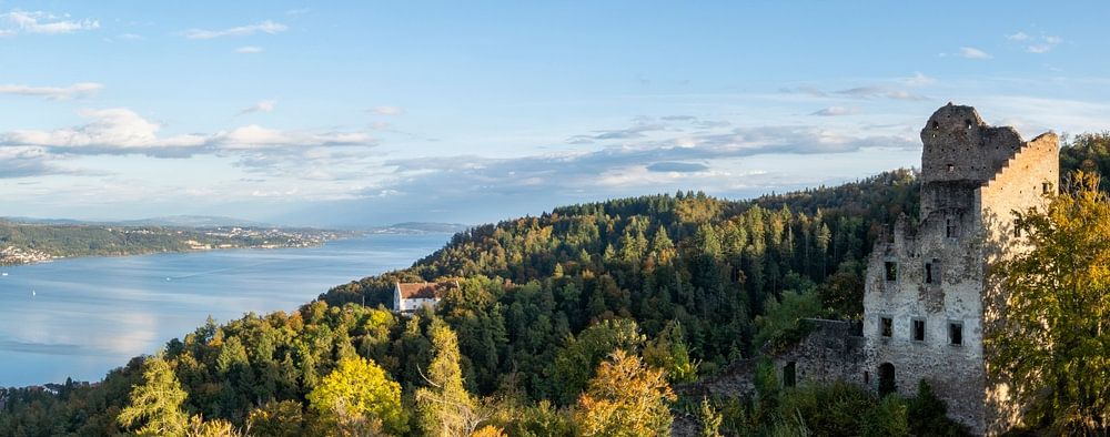 The ruins of Altbodman Castle on the Bodanrück with a view over Lake Überlingen. The warm light of the low sun streams over the already colourful autumnal forests. A mild autumn afternoon draws to a close.