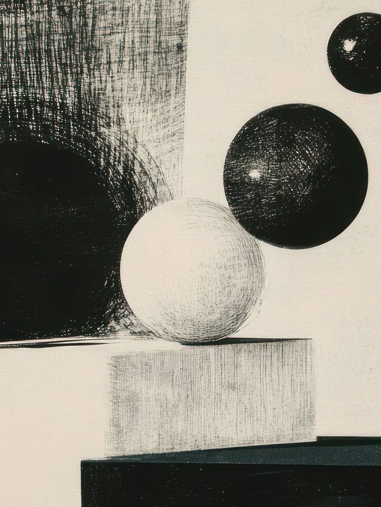 This intriguing black-and-white artwork plays with geometric shapes, light and shadow in a dynamic composition. The spheres and blocks seem to float in a delicate balance, evoking a sense of movement and tension. The contrasts between texture and smoothness, light and dark, give the work an almost surreal and futuristic feel.