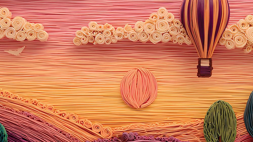 A surreal balloon floats above a landscape crafted from coiled pasta ridges and rising sunshine. The dreamy pink-and-orange sky is stitched from pasta threads and dotted with butterfly clouds.