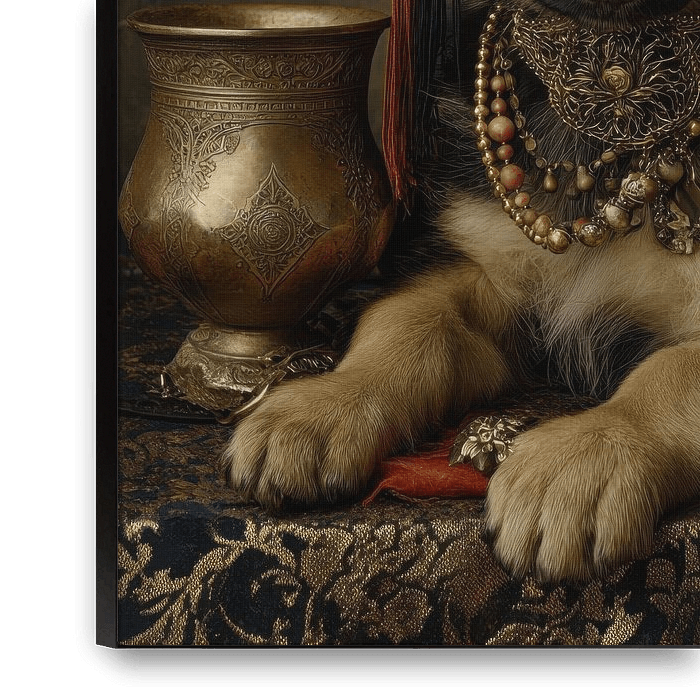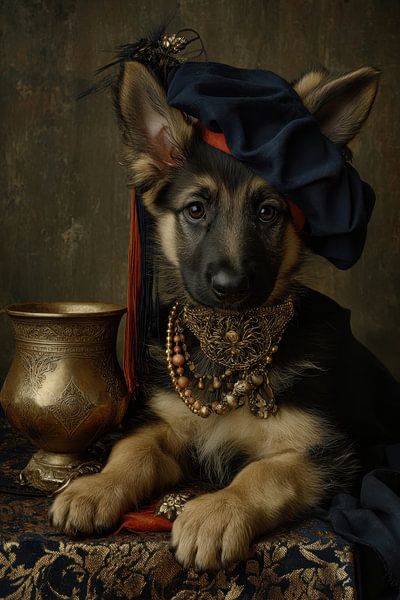 With his turban and ornate necklace, this young shepherd looks like an alchemist keeping secret recipes. The goblet beside him exudes mystery and luxury, as if he is thus bestowing an elixir of wisdom. A charming and playful portrait that pairs classic grandeur with canine humour.
