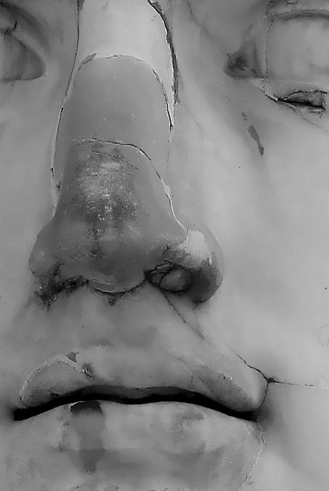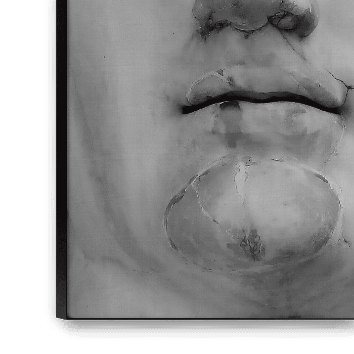 A close-up of an ancient marble statue’s face, worn and fractured by time. The cracks and missing pieces tell a story of history, resilience, and imperfection, adding to the statue’s haunting beauty. The smooth yet damaged surface reflects the passage of centuries, symbolizing both decay and endurance. The black-and-white tones enhance the dramatic textures, emphasizing the contrast between strength and fragility in this timeless work of art.