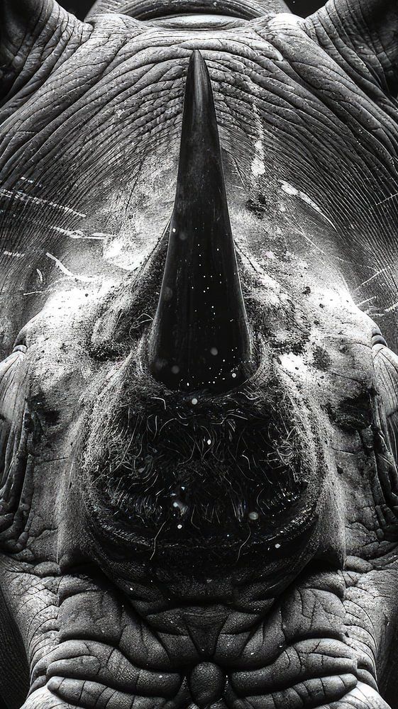 This impressive black-and-white artwork shows a rhino in close-up, captured in a moment of pure intensity and mystique.