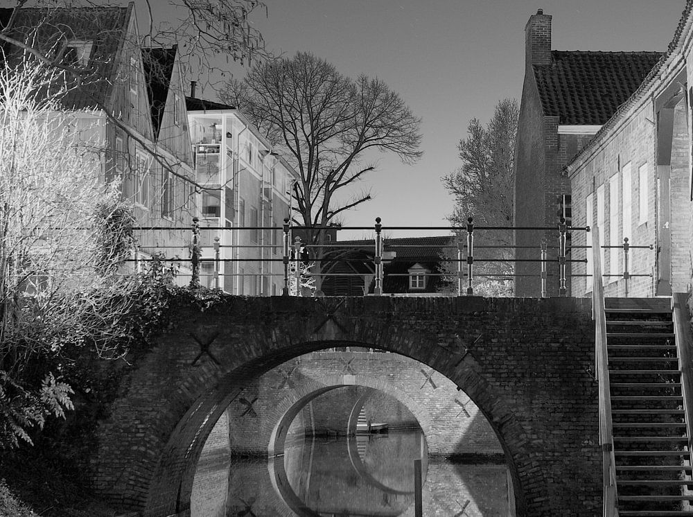 This mood photo was taken on a beautiful clear winter evening on the Binnendieze of 's-Hertogenbosch overlooking the little bridge at the Sisters of Orthenpoort and the Louwschepoort.