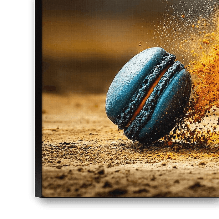 The dynamic movement and vivid contrasts exude playful energy, ideal for 'modern kitchen art' or 'high-speed food photography'. Suitable for kitchens, dining rooms, bakeries or as a cheerful accent in a hallway. Looking for 'sugar dust action art' or 'blue macaron decoration'? This work is a must-have for 'contemporary playful art' and 'energetic wall decoration'.