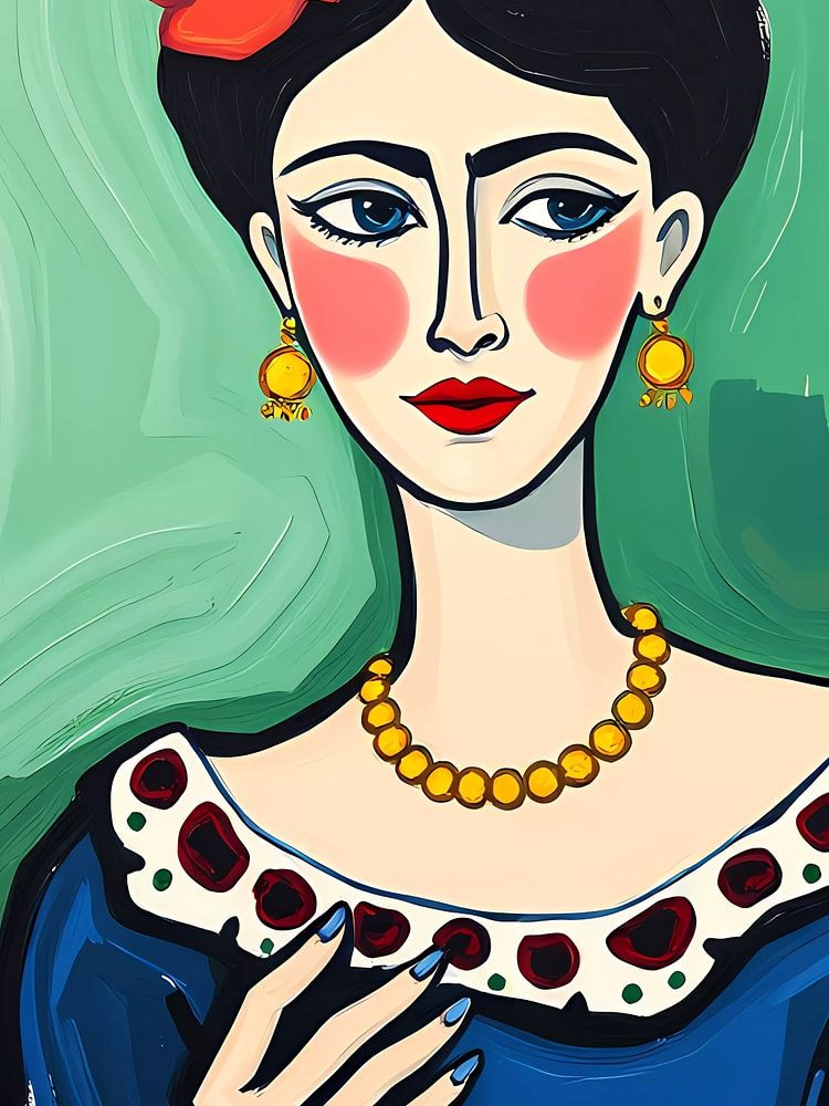 This artwork has a vibrant and modernist style with clear influences from Mexican culture and portraiture, reminiscent of Frida's iconic aesthetic. The painting depicts a woman with striking features, dark hair adorned with large red flowers, bold makeup, and a poised, elegant expression. She wears a blue dress with a decorative collar and yellow beaded necklace. The background is a muted green, which contrasts sharply with her red lips and floral adornment. The style leans towards a modern, abstract take on portraiture, with simplified shapes and strong, dark outlines.