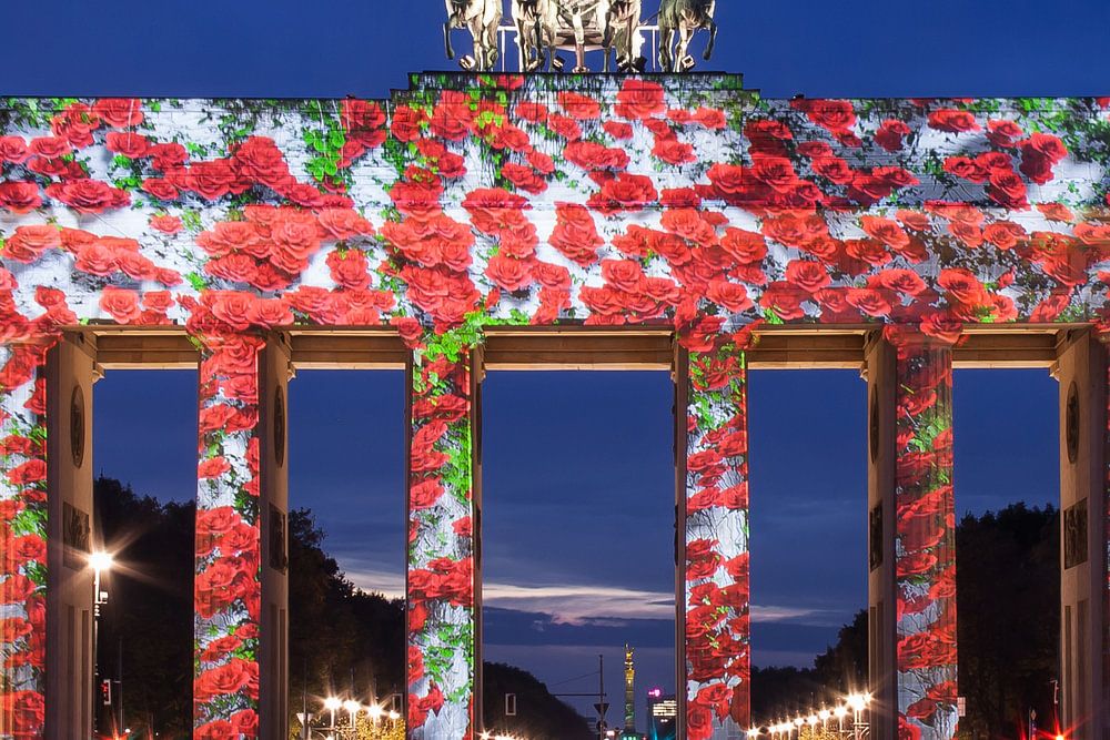 The famous landmark in the German capital in a special illumination on the occasion of a Berlin Festival of Lights. Here with a projection of roses.
