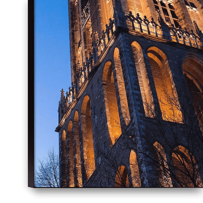 Buy the photo The Cathedral photographed from below during the blue hour by André Blom Fotografie Utrecht on canvas, ArtFrame, poster and wallpaper, printed on demand in high quality.