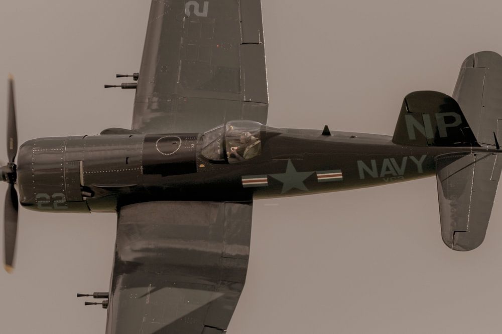 So this aircraft is a Chance Vought F4U-5NL Corsair, a later version of the Chance Vought F4U Corsair. The aircraft in the photo was built in 1951, served in the US Navy, then served in Honduras and ended up in France in 1986.
