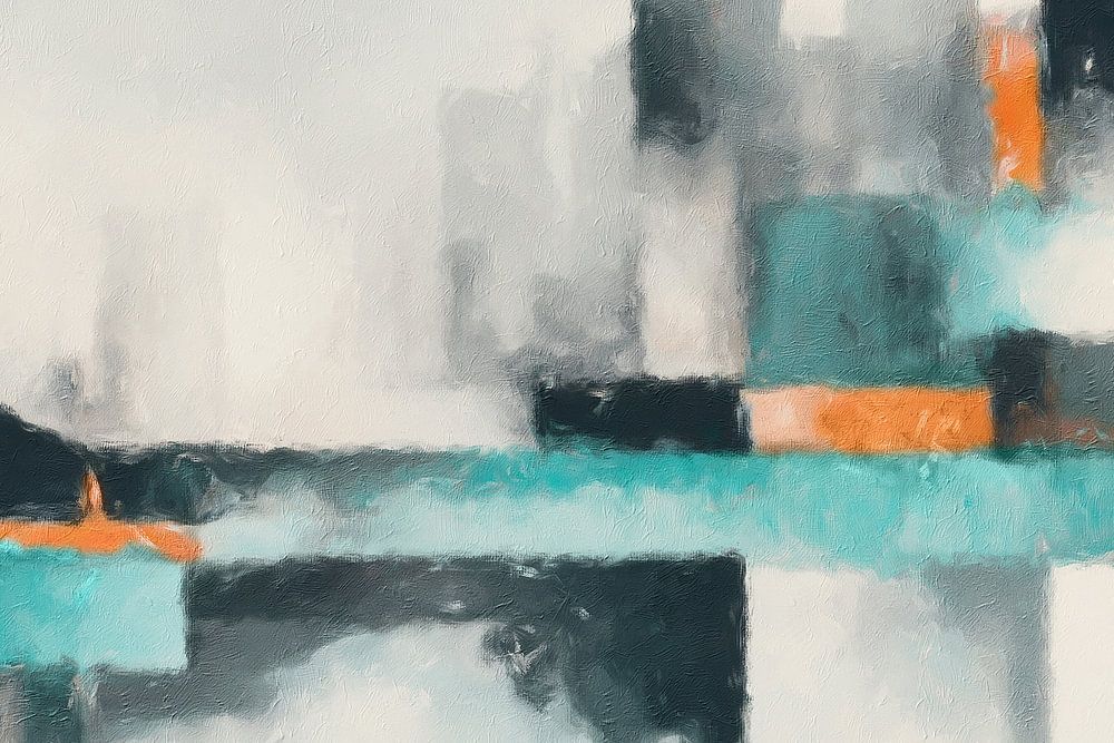 The buildings almost float in the mist, reflected in a calm water surface. The work evokes the Taoist idea that form and emptiness mirror and reinforce each other. Without mist no city, without silence no sound.