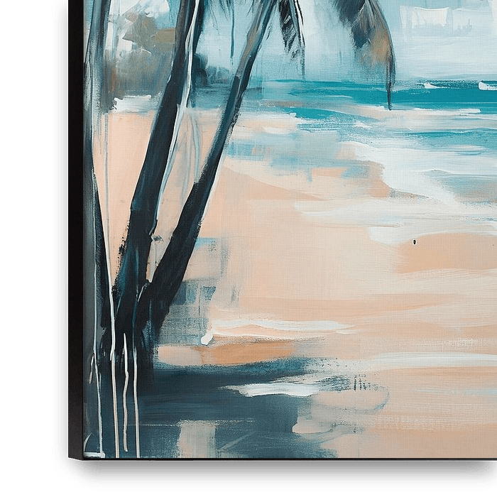 In this artwork, a beach is brought to life in a mix of blue colours and shades, which blend together beautifully and evoke a summer atmosphere.